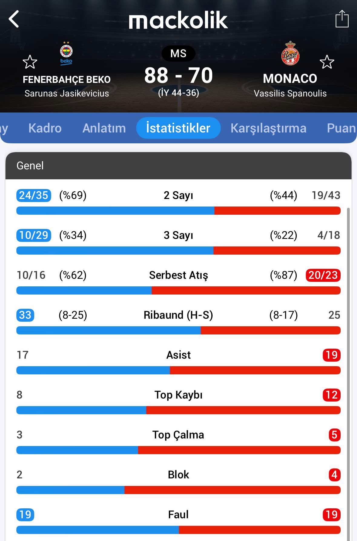 EuroLeague'in 30. haftasında temsilcimiz Fenerbahçe Beko, sahasında Monaco'yu ağırladı.