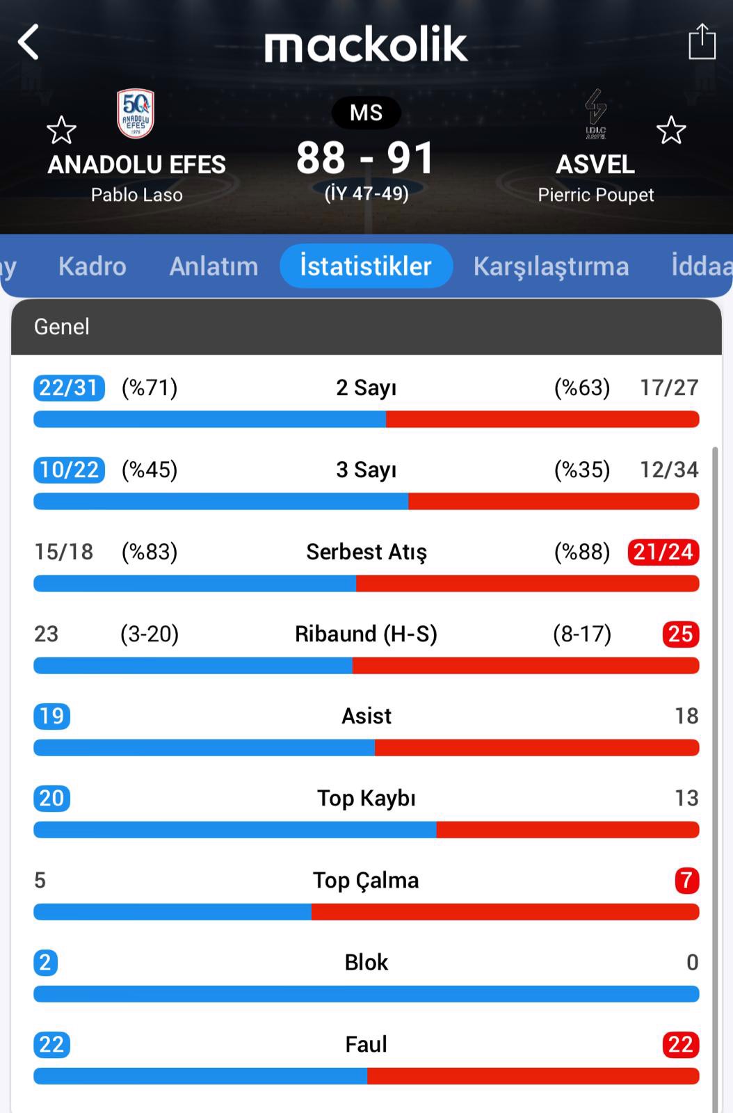EuroLeauge'in 30. haftasında Anadolu Efes konuk ettiği ASVEL'e 91-88 mağlup oldu. Lacivert-beyazlılar, ligde 21. mağlubiyetini aldı.