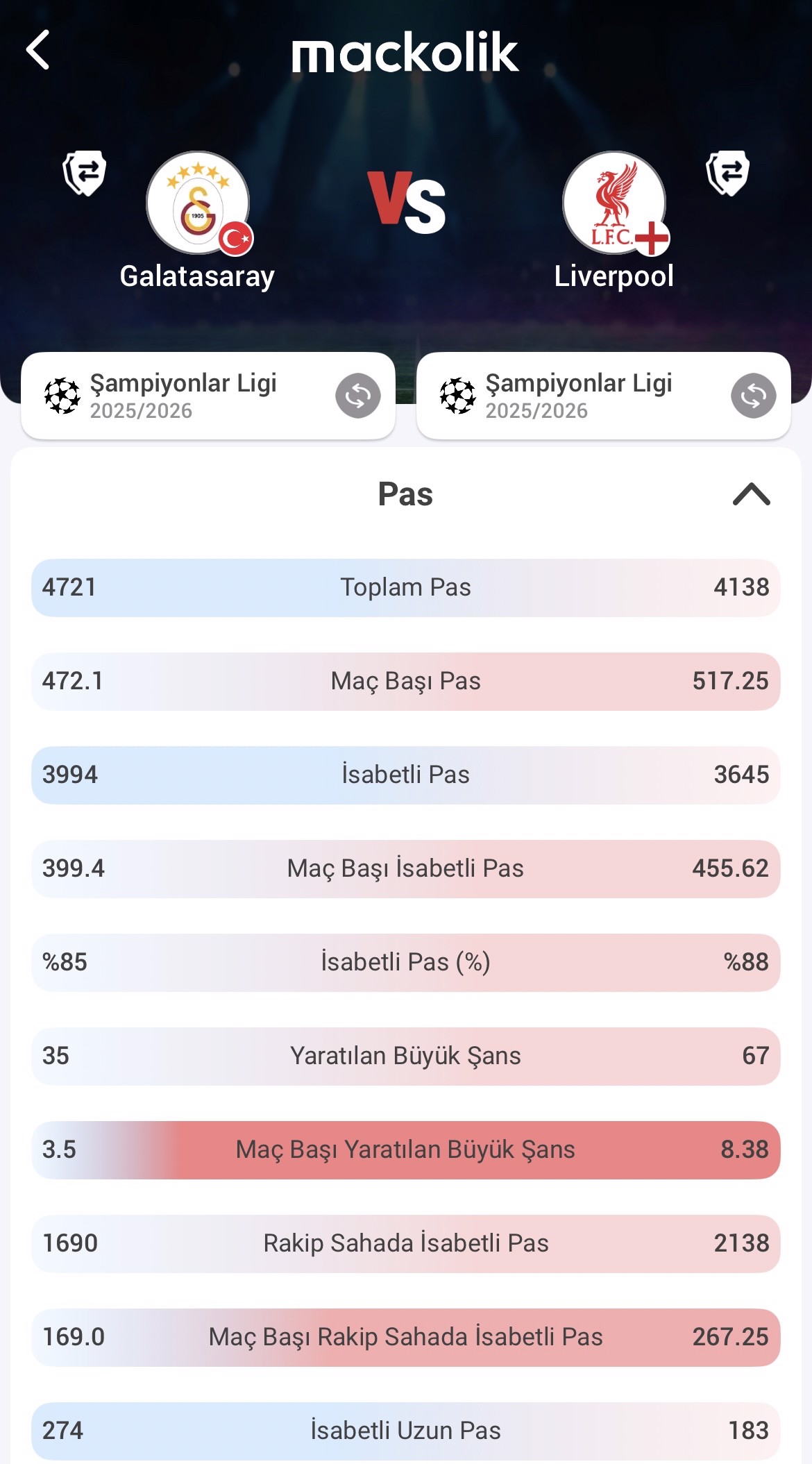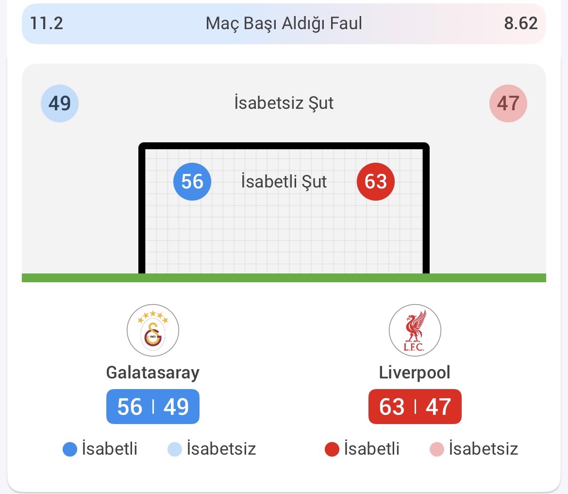 Galatasaray, rakibi karşısında isabetli pas istatistikleri ile öne çıkıyor. Sarı-kırmızılı ekip, toplam 4721 pas ile oynarken Liverpool'da bu sayı 4138 seviyesinde kaldı. İsabetli pas sayılarında da benzer bir tablo ortaya çıktı. Galatasaray 3994 isabetli pas ile oynarken Liverpool ise 3645 isabetli pas kaydetti.