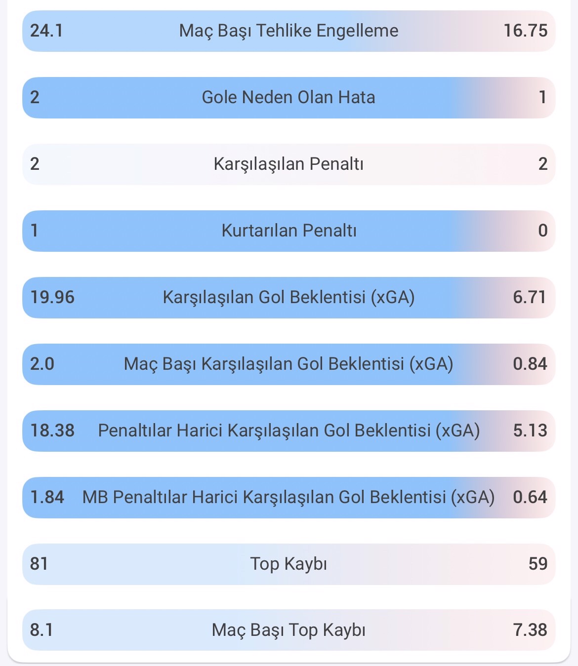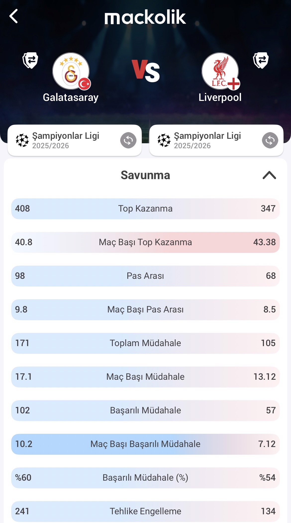 Tehlike engelleme istatistiklerinde de Galatasaray'ın daha aktif bir savunma performansı gösterdiği görülüyor. Sarı-kırmızılılar maç başına 24.1 tehlike engellerken, Liverpool'da bu ortalama 16.75 seviyesinde kaldı.