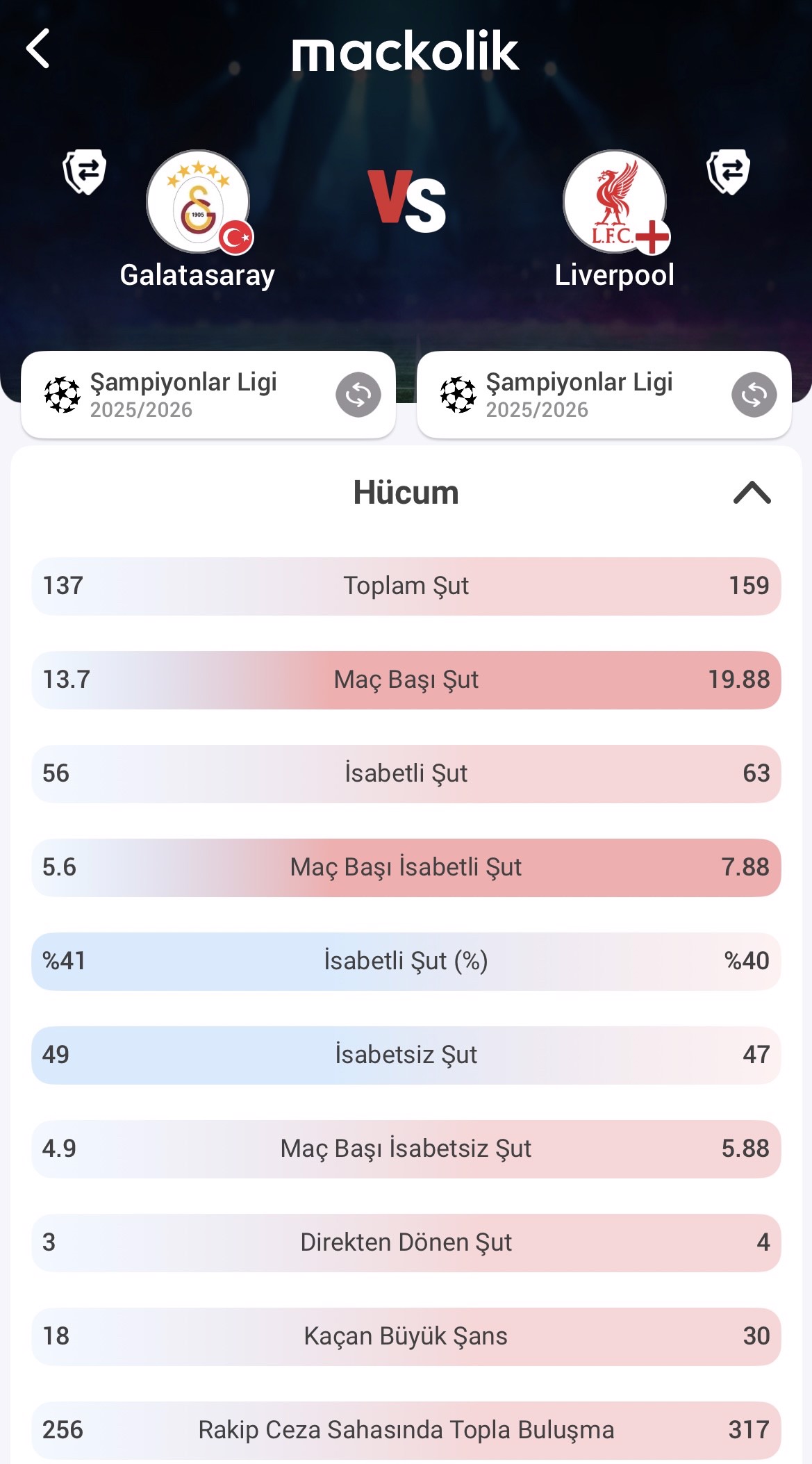 Hücum istatistikleri incelendiğinde Liverpool maç başına 19.88 şut ortalamasıyla Galatasaray'ın (13.7) önünde yer aldı. Kaleyi bulan şut oranında da daha yüksek bir verimlilik yakalayan Kırmızılar maç başına 7.88 isabetli şut oranıyla oynarken, Galatasaray'da bu rakamlar 5.6 seviyesinde kaldı. Arne Slot'un takımı, maç başına 39.62 rakip ceza sahasında topla buluşma ortalamasıyla rakibinin (25.6) önüne geçerek hücum bölgesinde daha fazla varlık gösterdi.
