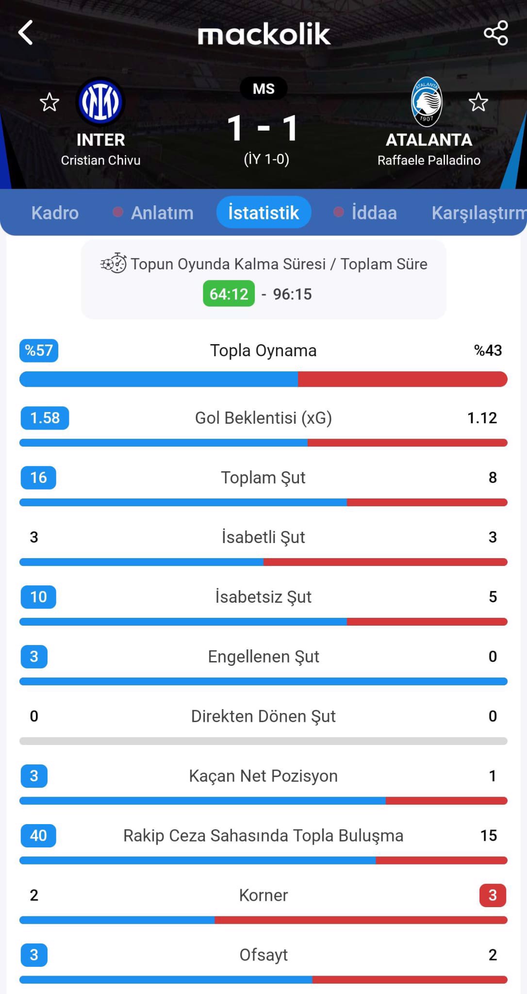 Kalan dakikalarda başka gol olmadı ve Inter ile Atalanda 1-1 berabere kaldı.