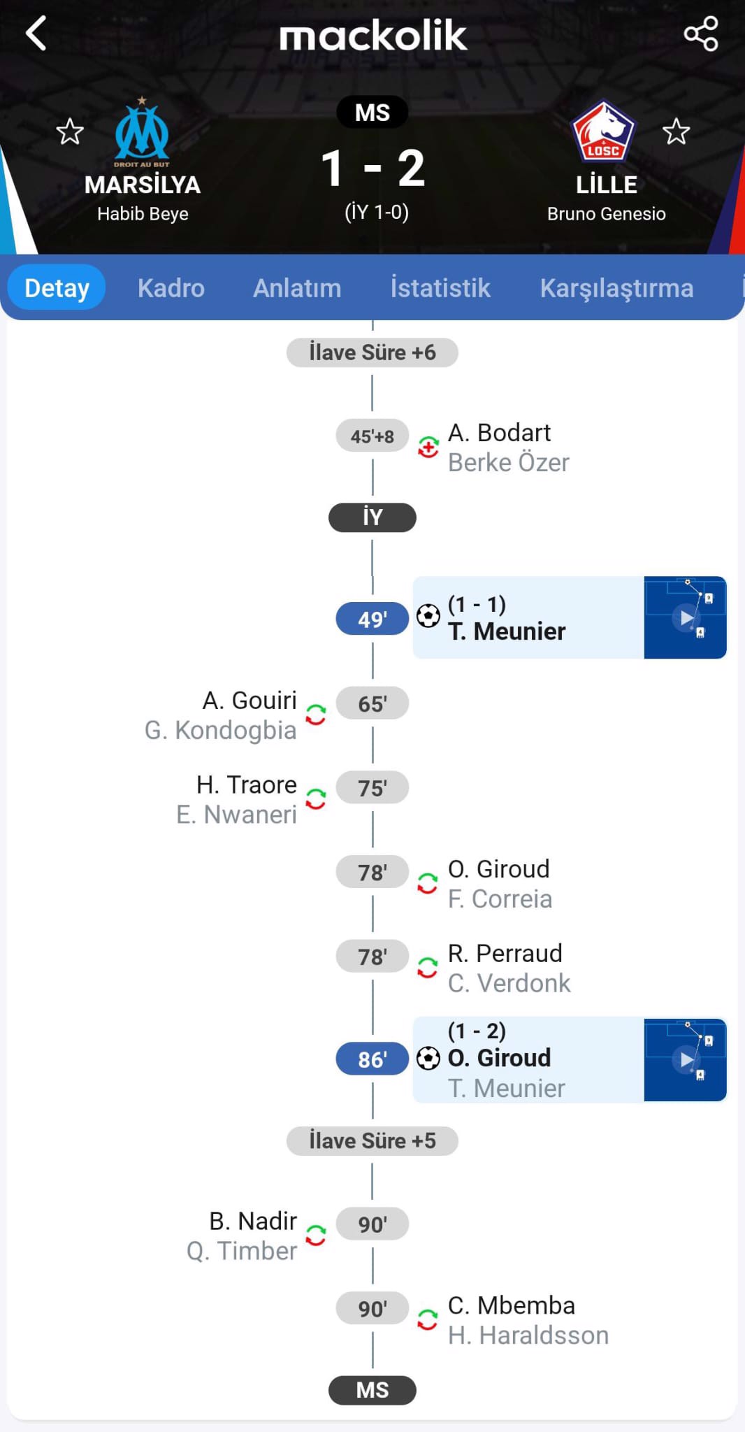 Ligue 1'de Lille, deplasmanda Marsilya'yı 2-1 mağlup etti. Karşılaşmada Lille forması giyen milli kaleci Berke Özer yaşadığı sakatlık nedeniyle oyuna devam edemedi.